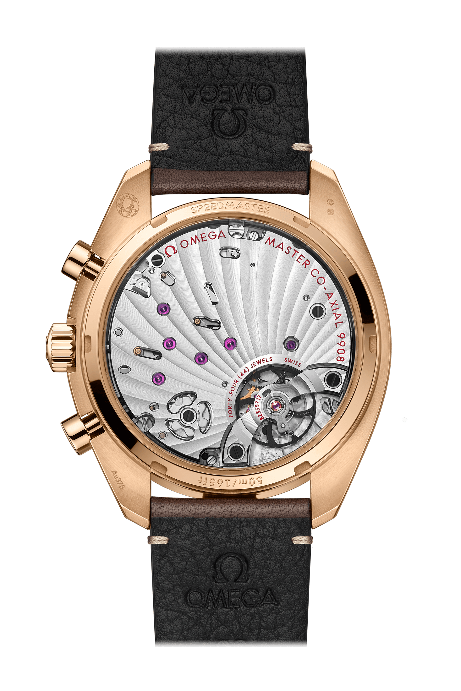 A silver-colored small seconds counter at 9 o’clock, a 60-minute and 12-hour coaxial totalizer at 3 o’clock, and a brown leather strap. It is powered by the hand-wound OMEGA Co-Axial Master Chronometer calibre 9908.